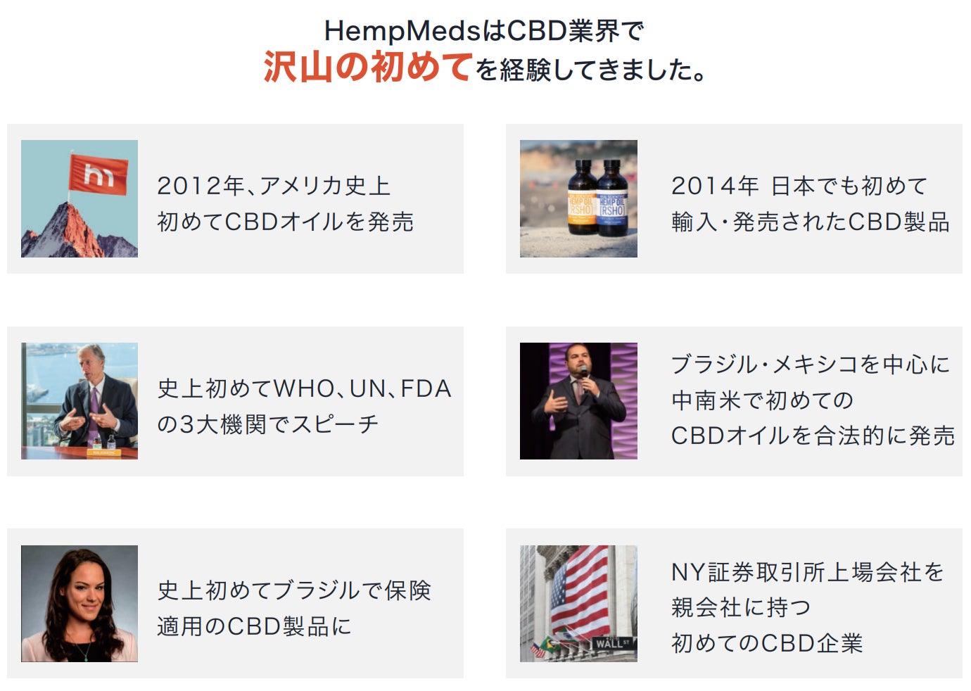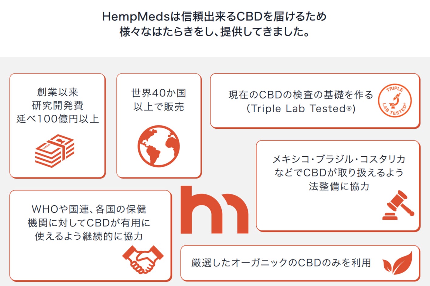 HempMedsは「Your Trusted CBD^(信頼できるCBDを)」と「We are the first®(私たちは初めての会社です)」」をコンセプトに、2012年にアメリカ史上初めてCBDオイルしたCBDのブランドです。40以上の国と地域での販売、研究開発費は延べ100億円超、ブラジルやメキシコでは医療現場でも活躍しています。