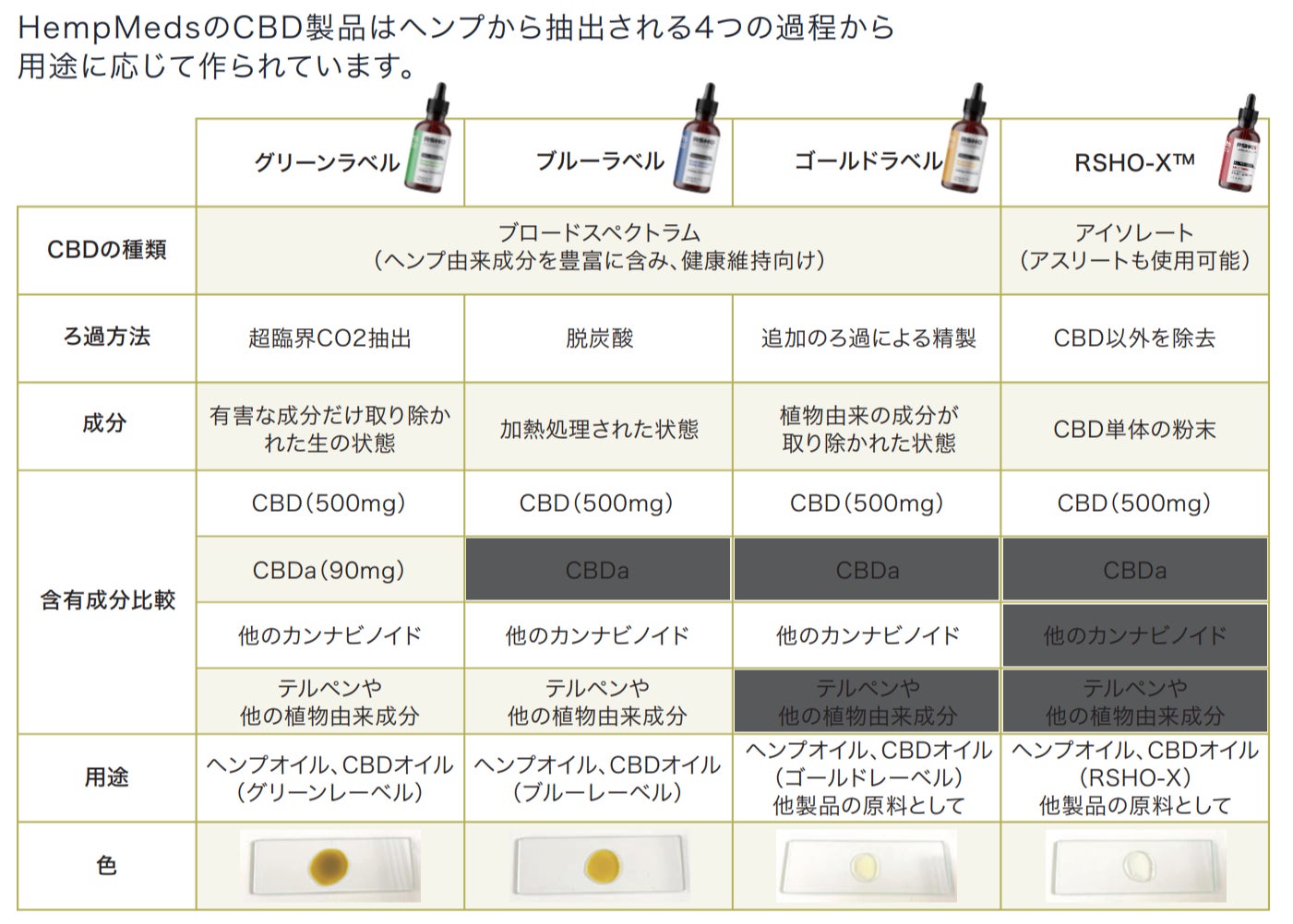 日本では数少ない規格の商品も含め4つのタイプの特徴的なCBDオイルがあります。