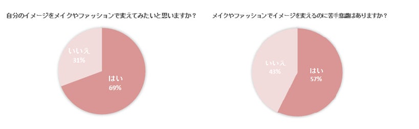 また自分のイメージをメイクやファッションで変えてみたいと思いますか?の問いでは89%が“はい”と回答したのに対して57%の人がメイクやファッションでイメージを変えるのに苦手意識があると回答。変えてみたいと思う反面、苦手意識からなかなかイメージを変えられない人が多いことがわかりました。