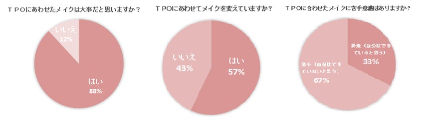 TPO別については88%の人がTPOに合わせたメイクは必要と回答したのに比べ、実際にTPOでメイクを変えている人は57%と約半数の人しかメイクを変えていませんでした。その理由としては苦手意識をもっている人も多いようで、67%の人がTPOに合わせたメイクが苦手と回答しました。
