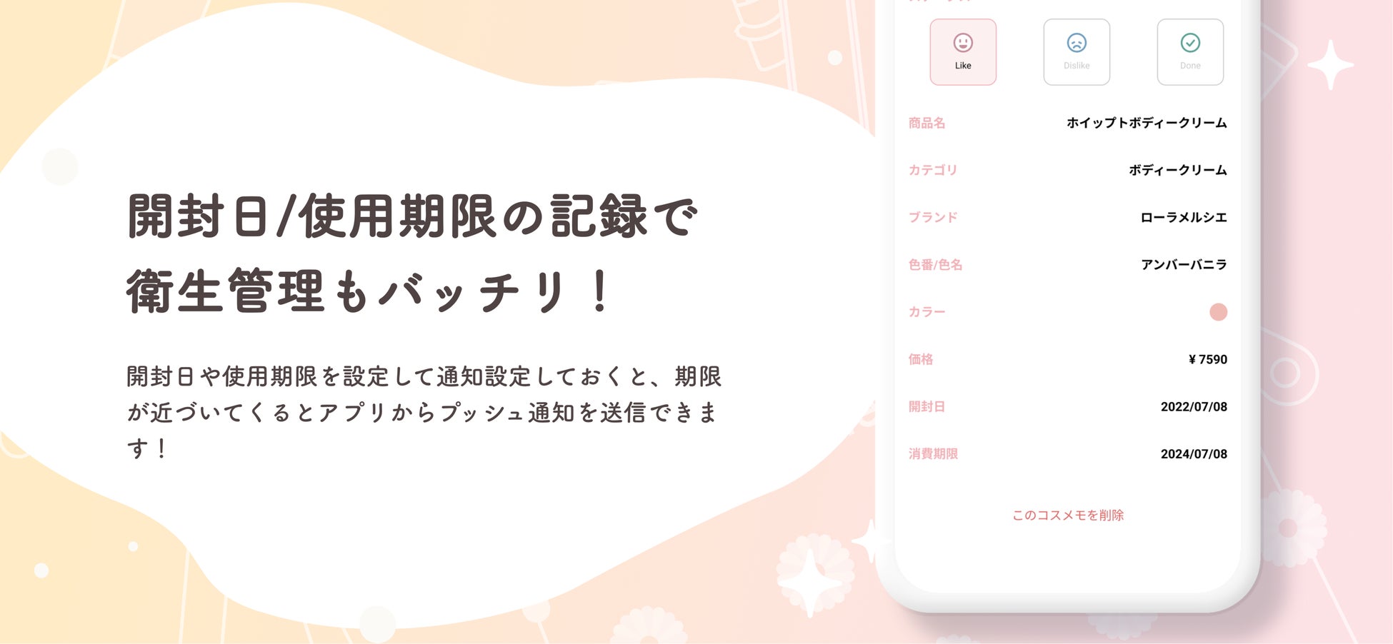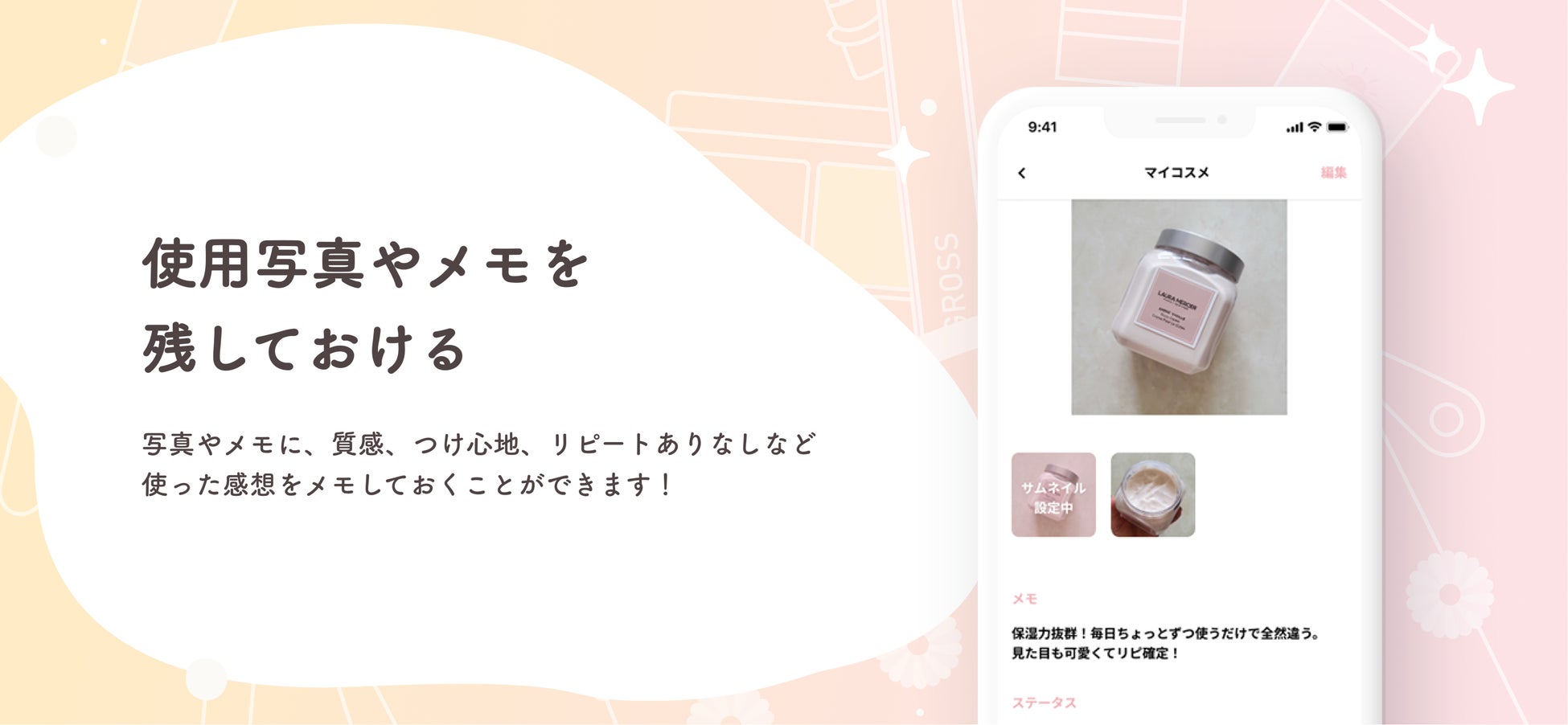 手持ちのコスメの把握、質感等の感想や写真の記録、衛生管理が全て一つのアプリで行えます。