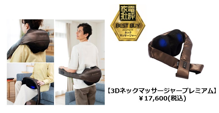 従来のネックマッサージャーと同様の回転式のもみ玉に加え、首元から肩をはさみもむ「肩もみ」の感覚を体感できる「もみアーム」を追加することで、同時に首と肩の広範囲へのもみほぐしを実現しました。「もみアーム」の先端はピンポイントなマッサージが可能な小さな球体形状が上下可動するようになっているため、首から肩にかけて”はさむ”ようにもみほぐしてくれます。また、【3Dネックマッサージャープレミアム】は「家電批評」(株式会社晋遊舎)にて「最高のフィット感」、「もみ玉の当たりの良さ」が評価され、〈2022年6月号ベストバイ〉として選出されています。