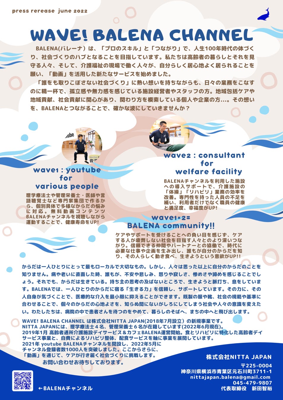 バレーナチャンネルは、株式会社NITTAJAPANがお届けするyoutubeチャンネルです。開設以来、高齢者福祉の現場で、動画を見ながら一緒に運動するためのコンテンツを中心に配信してきました。新たな取り組みとして、2022年7月から、理学療法士や管理栄養士・医師や言語聴覚士など専門家集団で作る、個別具体で多様なからだの悩みに対応する、新しい動画コンテンツの配信を始めました。これは、日々アップデートされていく「専門家の持つ知識や経験」を広く公開し、ケアが十分に行き届いていない人々と繋がり、リアルな現場での支援につなげていくための取り組みです。