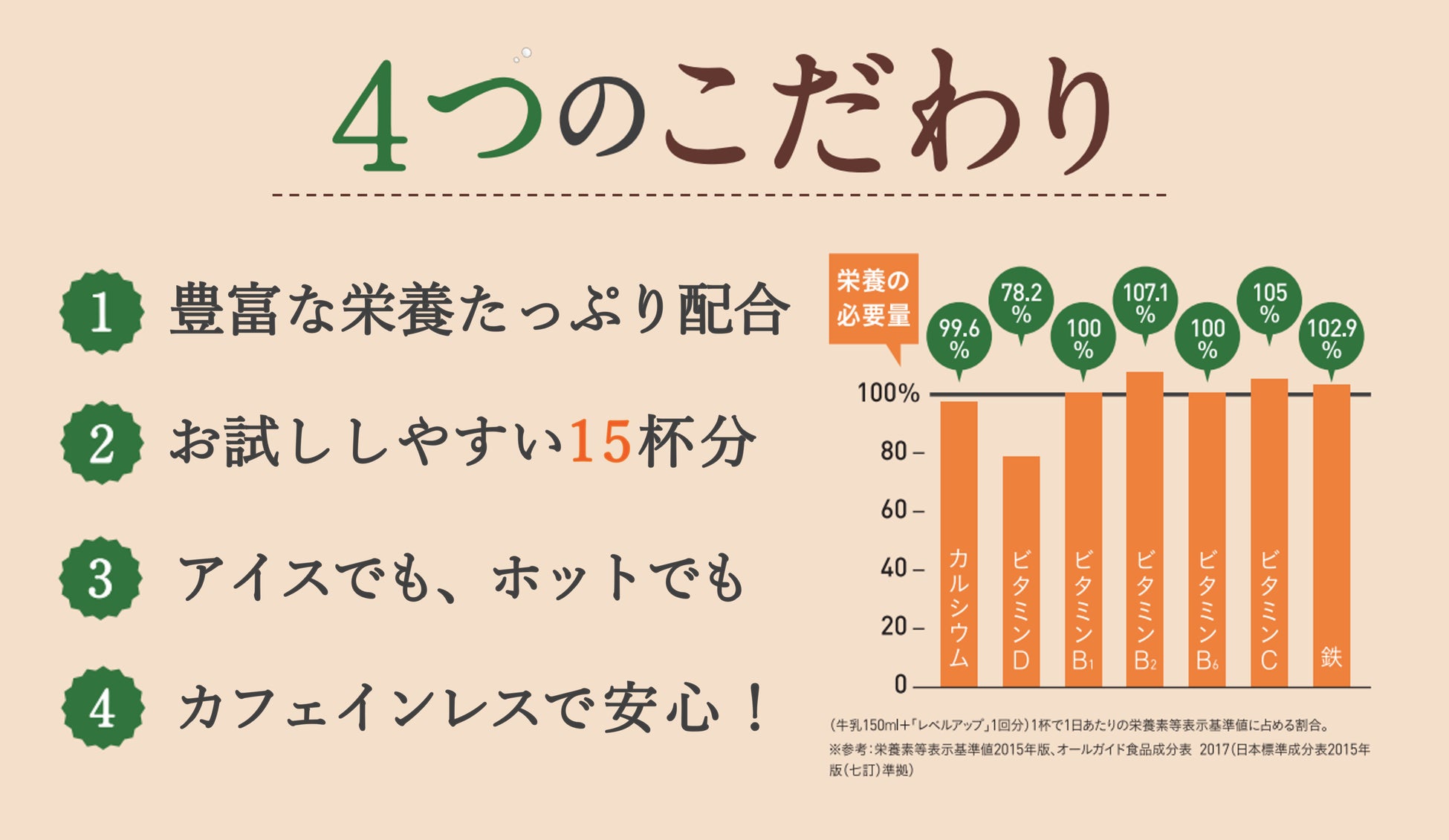 (※3)牛乳150ml+「レベルアップ」1回分 1杯で1日あたりの栄養素等表示基準値に占める割合。※参考:栄養素等表示基準値2015年版、オールガイド食品成分表 2017(日本標準成分表2015年版(七訂)準拠)