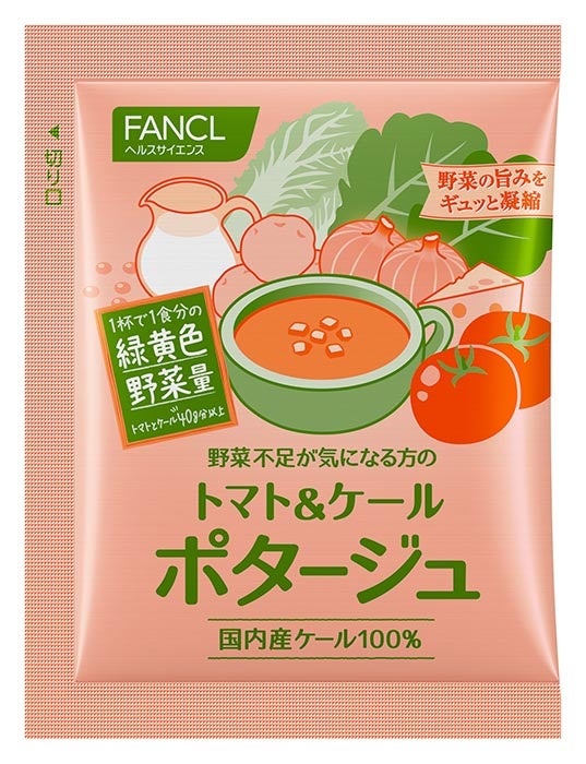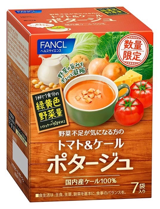株式会社ファンケルは9月16日(金)から、「トマト&ケールポタージュ」(1箱7袋入り/価格:1,080円<税込>)を通信販売と直営店舗にて、数量限定で発売します。トマトと野菜の王様「ケール」を原料とし、1杯で1食分の緑黄色野菜量(40g)を使用しながら、おいしくお召し上がりいただける製品です。
