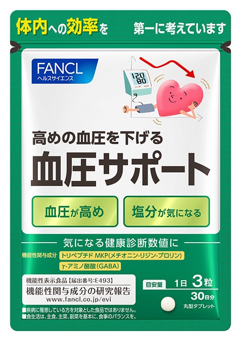 高めの血圧を下げ正常な血圧を維持する、機能性表示食品です。同製品に配合している機能性関与成分「トリペプチドMKP(メチオニン‐リジン‐プロリン)」と「γ‐アミノ酪酸(GABA)」が、高めの血圧を下げ、正常な血圧を維持することが報告されています。この成分の組み合わせは当社のオリジナルです。