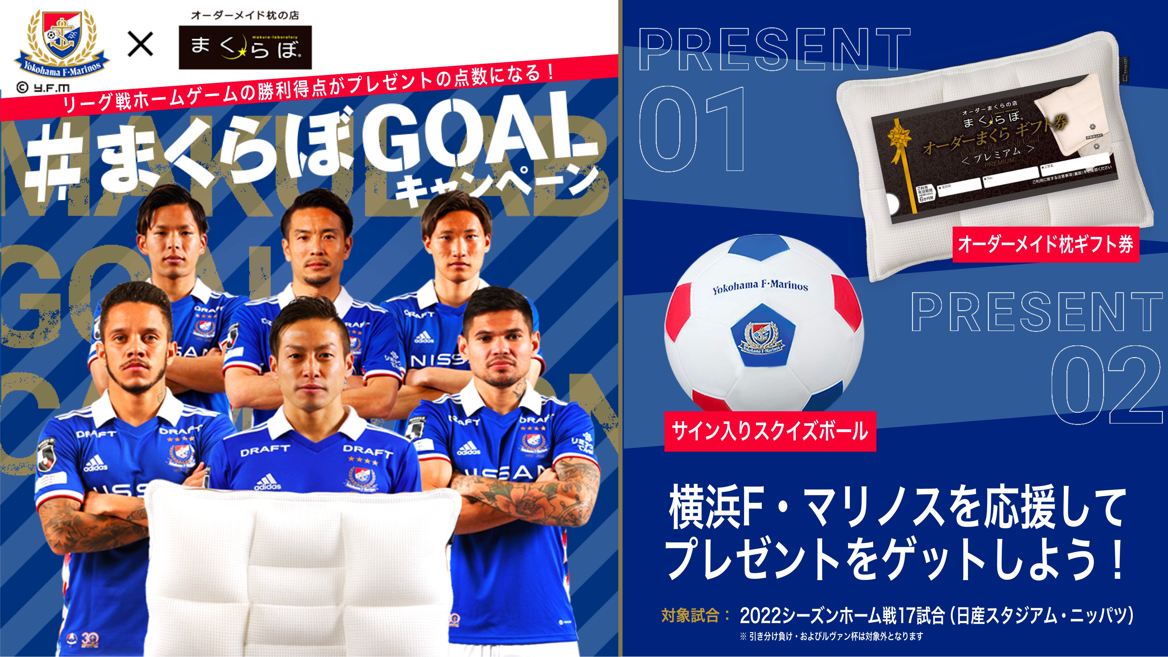昨シーズンに引き続き、ファンやサポーターの皆さまと一丸となってチームを応援する「#まくらぼGOALキャンペーン」をまくらぼ公式SNSにて実施しています。このキャンペーンは、横浜F・マリノス勝利時の得点がプレゼント当選数となり、点を入れれば入れるほど当選者が増えるシステムです。当選者には、まくらぼのオーダーメイド枕ギフト券と選手の直筆サイン入りスクイズボールをプレゼントしています。