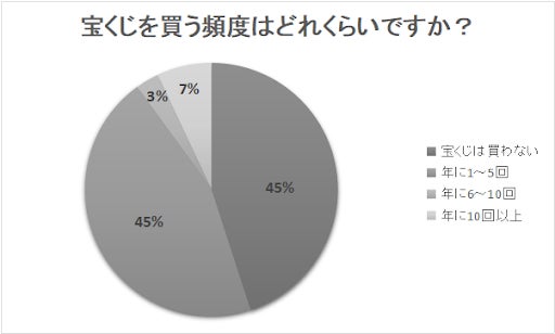 また、「年に6〜10回」と答えた人は3%、「年に10回以上」と答えた人が7%という結果です。この結果からみると宝くじを購入する人と購入しない人は約半々といったことがわかります。