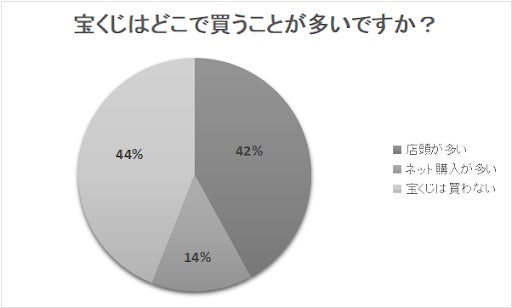 「宝くじは買わない」と答えた人は44%いましたが、多くの人は「店頭が多い」と答え、42%でした。そして、「ネット購入が多い」と答えた人は14%と少数意見でした。