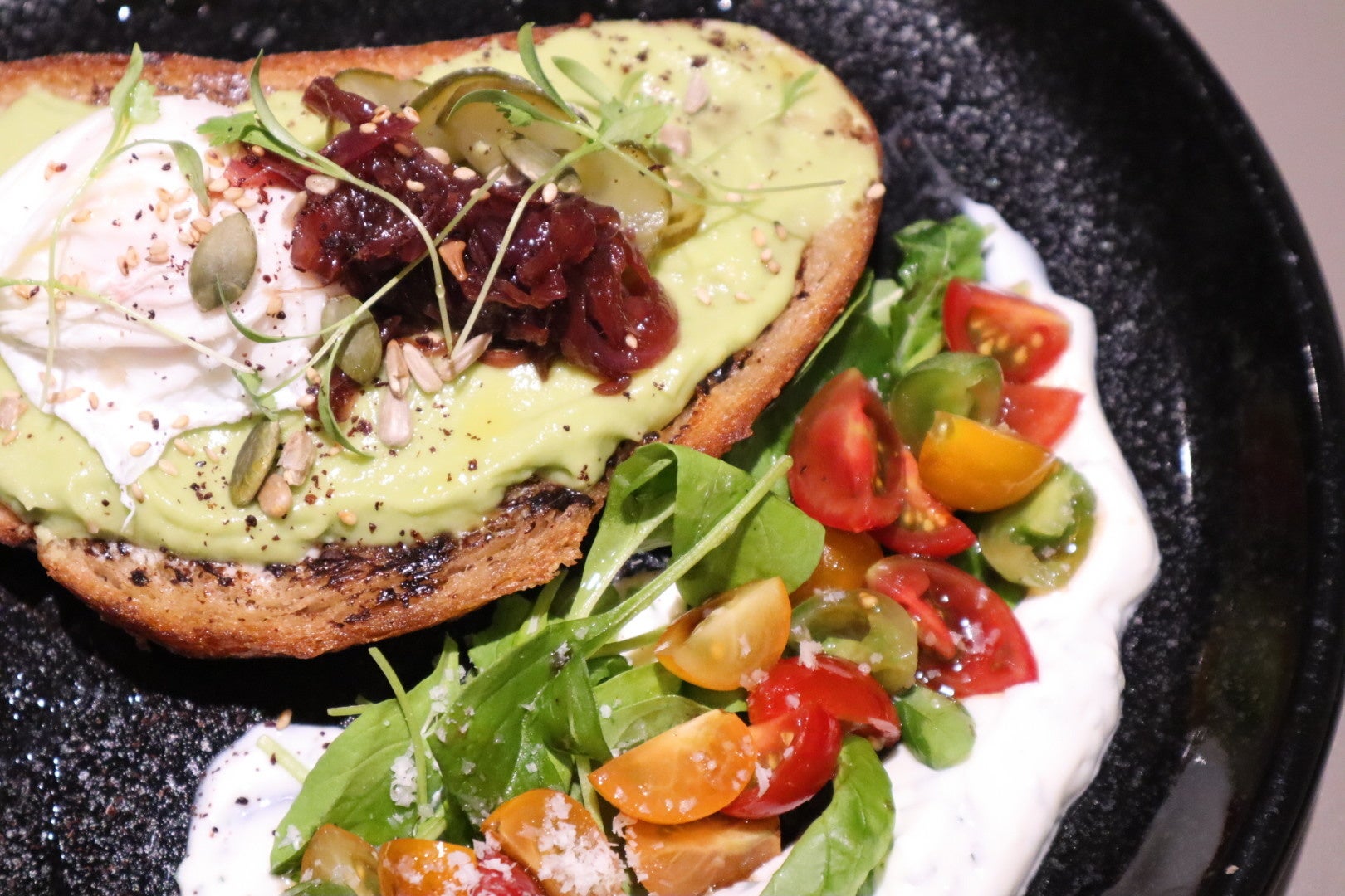 マーマイト、レバナ(水切りヨーグルトと香草のソース)、バルサミコドレッシング、オニオンジャム、ピクルス、サワードを取り入れた爽やかなアボカドトースト。