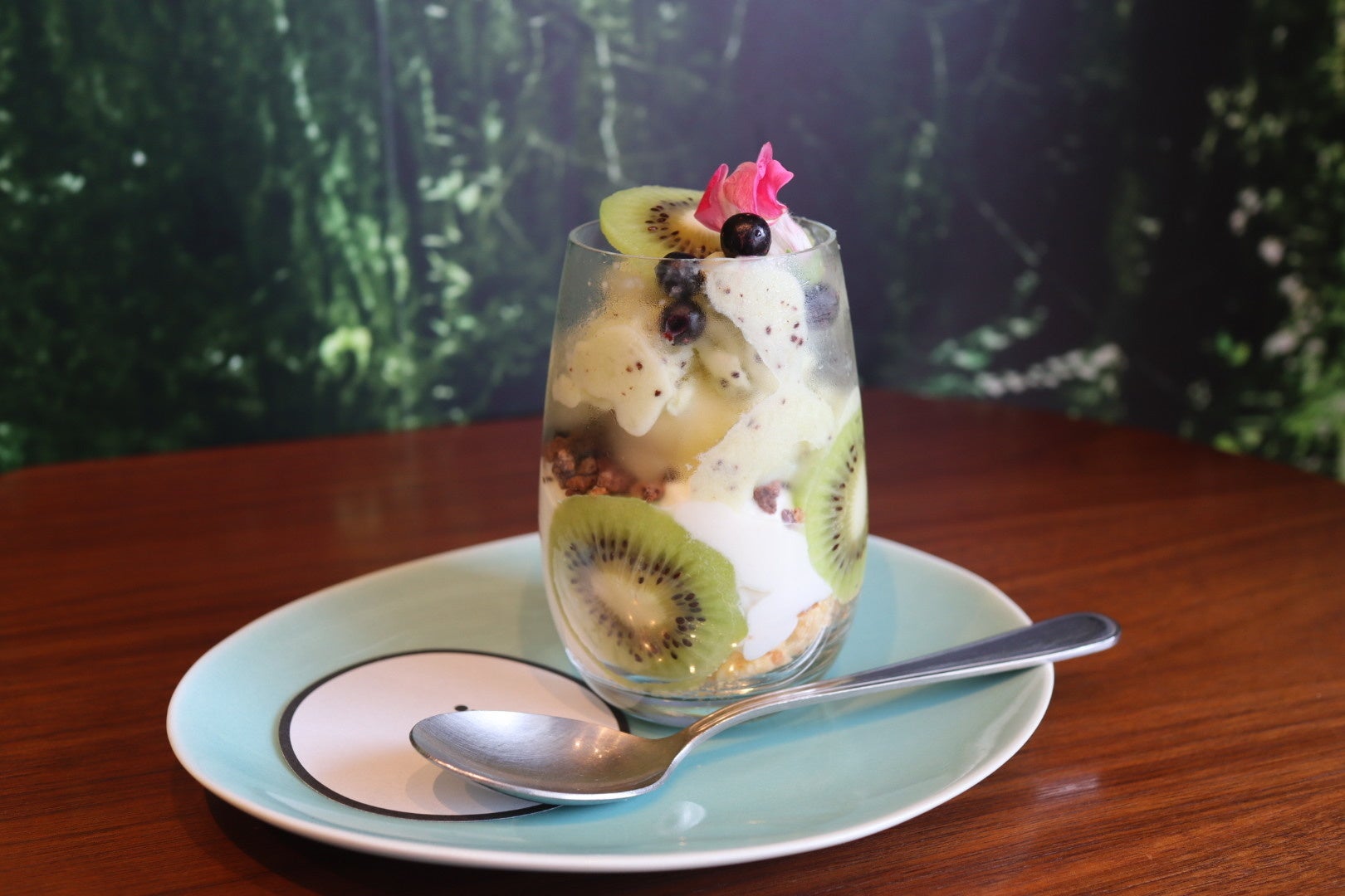 キウイヨーグルトのアイスとヨーグルトムース、キウイソースを使った暑い日にオススメのパフェ。