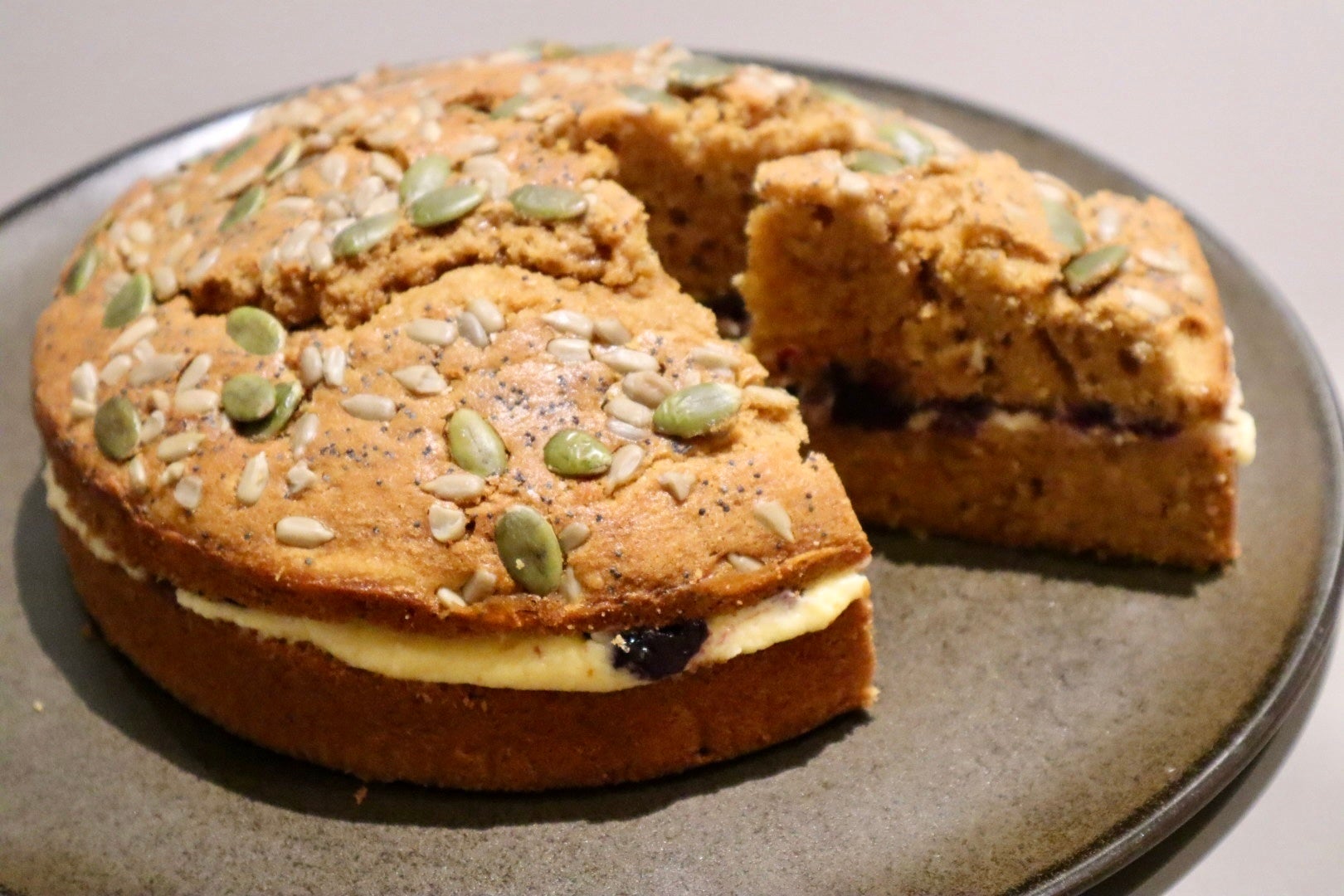 ニュージーランドで好んで食べられる、ビールづくりの過程で出る酵母を主原料とした発酵食品のマーマイトを使用。バタークリームとブルーベリージャムを挟んでヴィクトリアケーキ風にアレンジしたケーキ。
