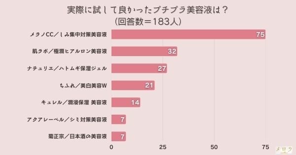 「実際に試して良かったプチプラ美容液は?」とアンケート調査した結果、1位は『メラノCC/しみ集中対策美容液』でした。