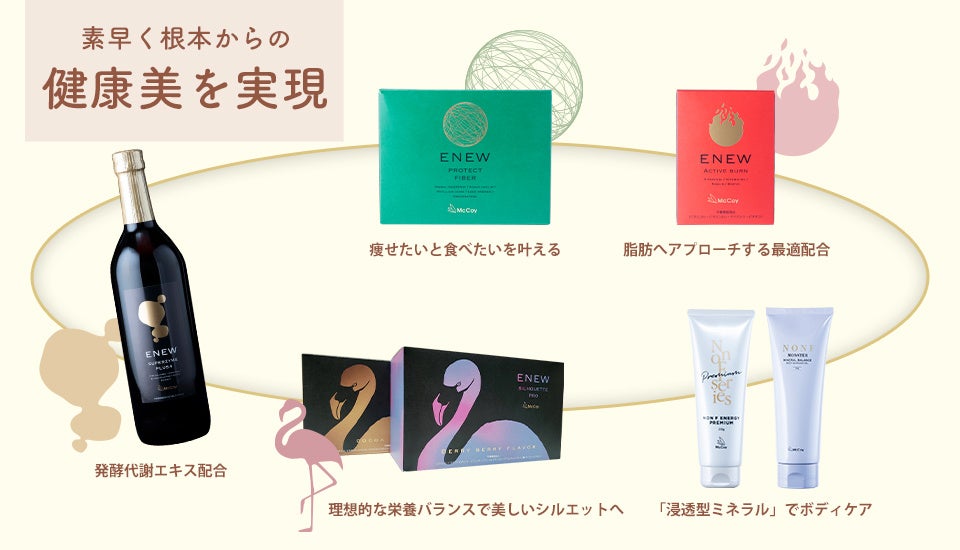 『ENEWビューティープログラム』は2022年7月7日、「ENEWサプリメントシリーズ」発売と共に誕生しました。お手軽に腸活・菌活をサポートする「ENEW PROTECT FIBER」をはじめとするインナーケア「ENEWシリーズ」と、マッコイこだわりの”浸透型ミネラル”を配合したボディケア「NONFシリーズ」の組み合わせで「美味しく食べて綺麗に痩せる」を叶える、新しいダイエットプログラムです。
