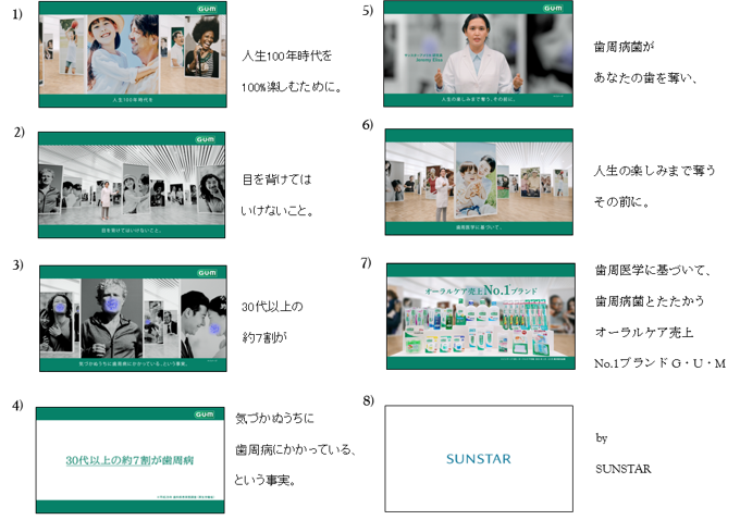今回のCMでは、巨大なパネルで様々な生活者を投影しながら、30代以上の約7割が歯周病に罹患していることを表現します。さらに、サンスターアメリカ(Sunstar Americas Inc.)で実際に研究員として働くジャーミー エリサ(Jeremy Elisa)がCMに登場し、人生100年時代を100%楽しむためには、歯周病リスクを正しく理解して適切な対策を講じることが大切だということを伝えます。後半ではブランドとしての姿勢・製品ラインナップの幅広さを表現することで、歯周病予防の最適な手段はG・U・Mであることを提案しています。