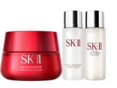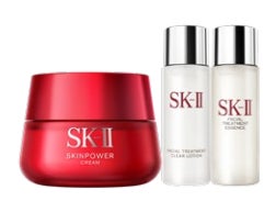 「スキンパワー クリーム」80gの価格でSK-IIを代表する化粧水「フェイシャルトリートメントエッセンス」のミニサイズ、ふき取り化粧水のミニサイズがセットに。