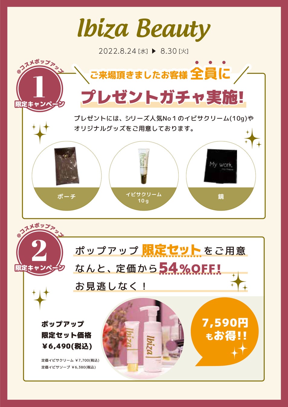 オンラインストアでも販売していないイビサクリームとイビサソープのセットがポップアップ限定で登場します。単品でご購入いただくお値段よりも54%OFFの6,490円(税込)でお求めいただけます。