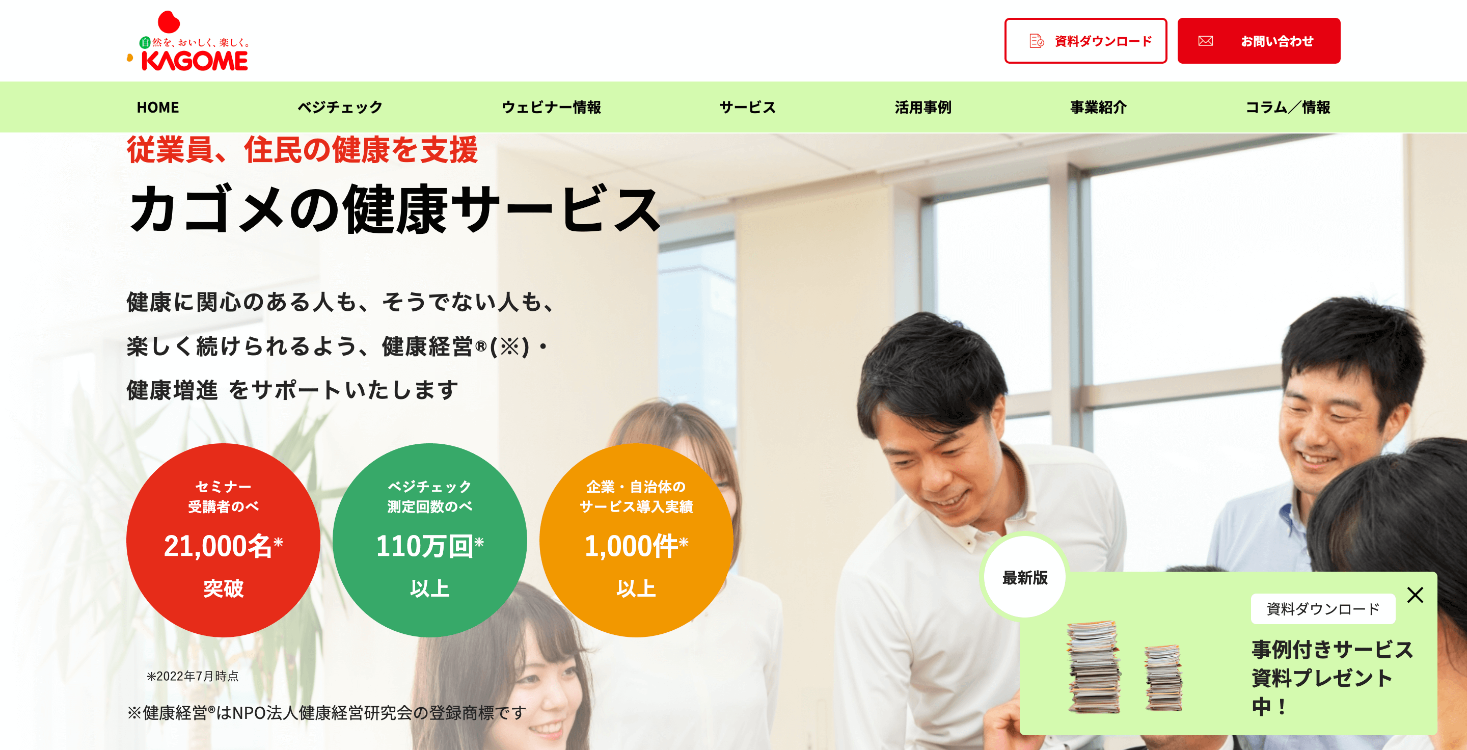 カゴメ株式会社健康事業部は、健康に関⼼のある⼈も、そうでない⼈も、楽しく続けられるよう、健康経営®、健康増進 をサポートしております。推定野菜摂取量を見える化するベジチェックをはじめとし、セミナーや、アプリなど、さまざまな取り組み・サービスで企業の健康経営や自治体住民の健康増進に取り組んでいます。