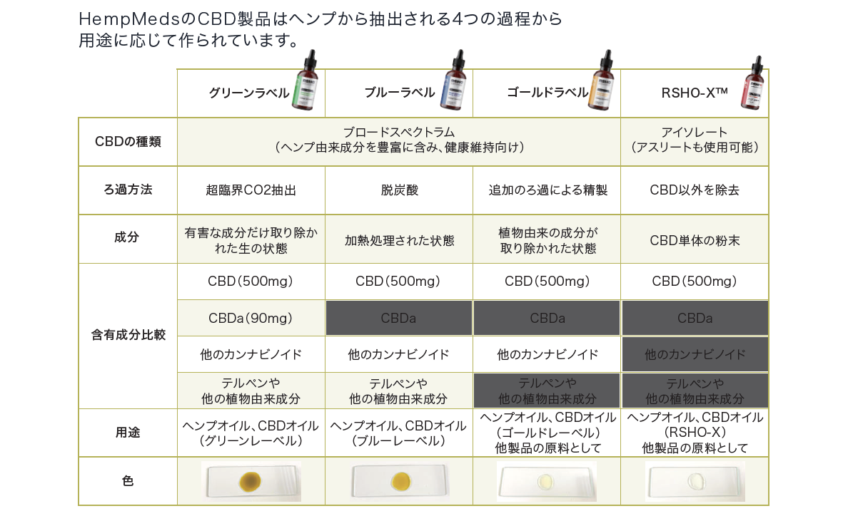 CBDa(CBD酸)などヘンプ由来の成分を多く含む「RSHO グリーンラベル」から、用途や目的・濾過の度合いに応じて「RSHO ブルーラベル」「RSHO ゴールドラベル」、そしてCBDだけにアクセスしたい方向けにはCBD以外のヘンプ由来成分を含まない「RSHO-X ナチュラル・アイソレートティンクチャ」をご用意しております。