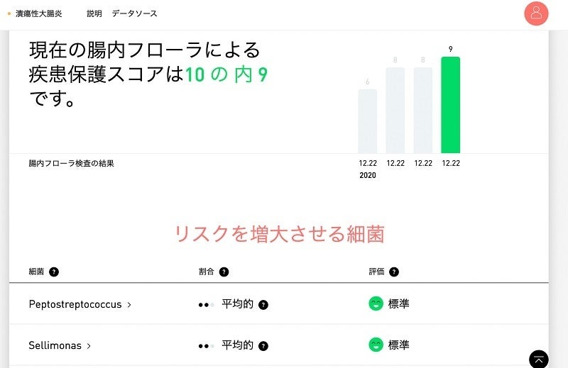- アトラス腸内フローラ検査<https://atlasbiomed.co.jp/microbiome>を使うと、潰瘍性大腸炎とクローン病のリスクスコアを知ることができます。さらに、自分固有の腸内フローラが持つ炎症誘発の可能性を知ることができます。