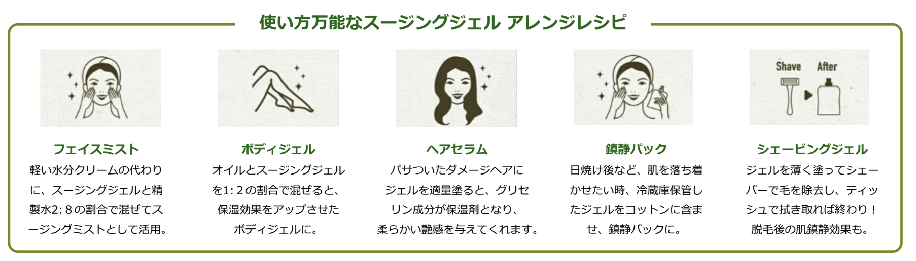 また、従来の商品と同様、ベタつかない水分ジェルタイプで、肌に素早く水分を補給し、長時間保湿効果を維持。火照りや乾燥、日差しにより刺激された肌をリラックスさせてくれます。