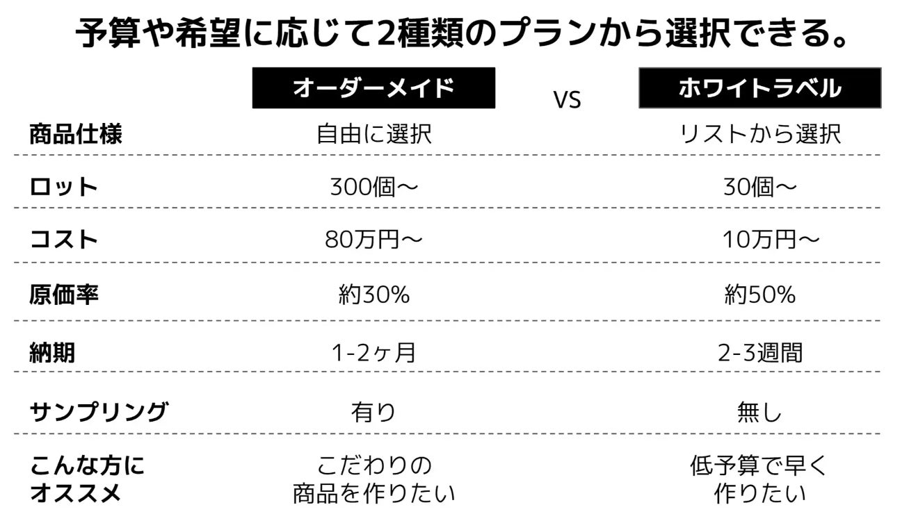 「tokyo mooon」の取り扱うOEMには、こだわりの商品を作りたい事業者に適した「OEM(オーダーメイド)」と、迅速に低価格でブランド立ち上げをしたい事業者向けの「OEM(ホワイトラベル)」の2種類のサービスがございます。<注釈>