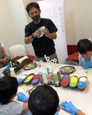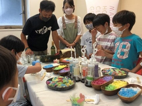 参加した子どもたちは、カラフルなキューブを丁寧に重ねたり、ジェル状の具材を丸めてみたりと、思い思いに創作活動を行っていました。小学6年生の男の子には、講師の今城さんから特別に小型のバーナーが渡され、火の扱いについてもレクチャー。表面を滑らかに整える道具として安全な使用方法が伝授されていました。