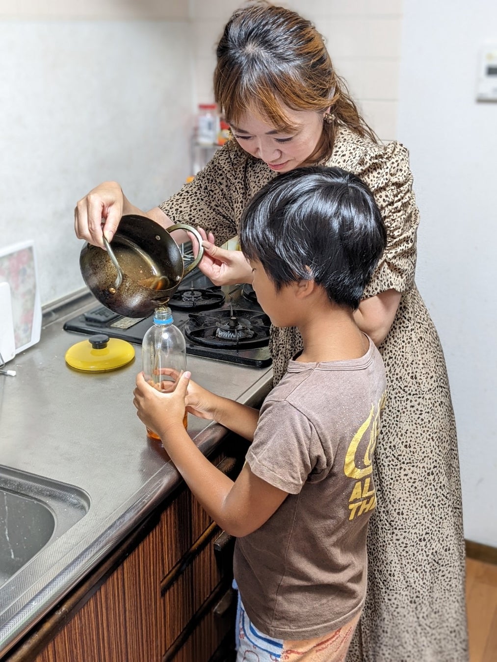 そのため、まずは家庭で廃油を集めることからスタート。唐揚げやとんかつなど、子どもたちの好きなメニューでは油をたくさん使用しがちです。普段ママが料理に使った油の処理など見たことがなかった子どもたちも、一緒になってキャンドル制作のための廃油集めを手伝いました。