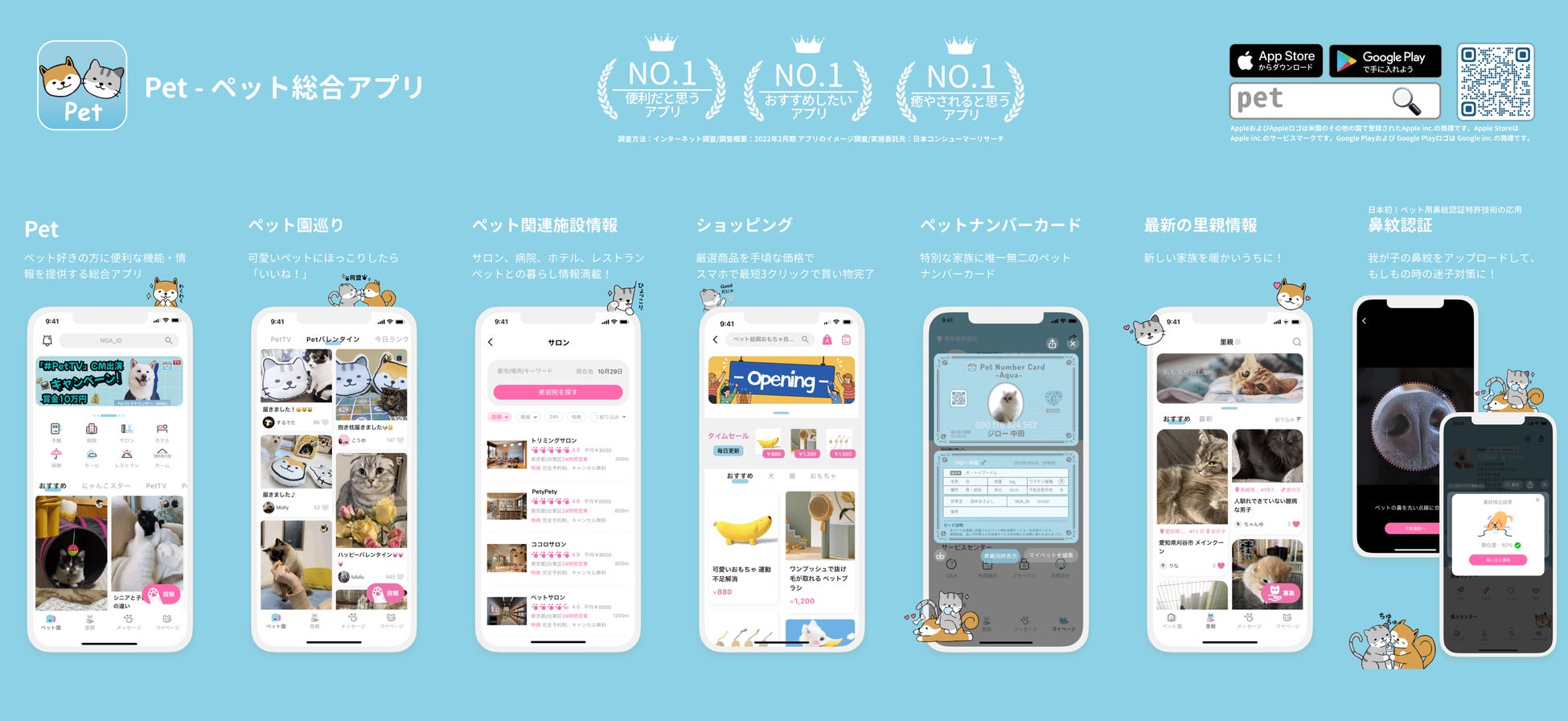 動物病院やペットサロン、ペットホテル、ペット可レストランなどの施設や、飼い主向け保険サービス、里親募集情報なども掲載しており、さらにはペット用品がアプリ内ポイントで購入できる『Pet』モールも運営している、ペット好きな人々が便利に、そして楽しく暮らせるプラットフォームを提供しています。