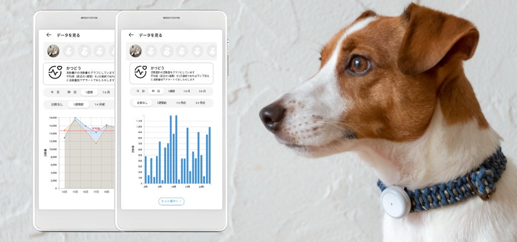 活動量・ジャンプ回数・睡眠時間を測定しグラフで確認でき、愛犬愛猫ひとりひとりデータ推移から異常を早期にアプリでお知らせします。さらには全国に1,100病院以上あるPLUS CYCLE対応病院と連携することにより、「予防動物医療」を目指し展開しています。
