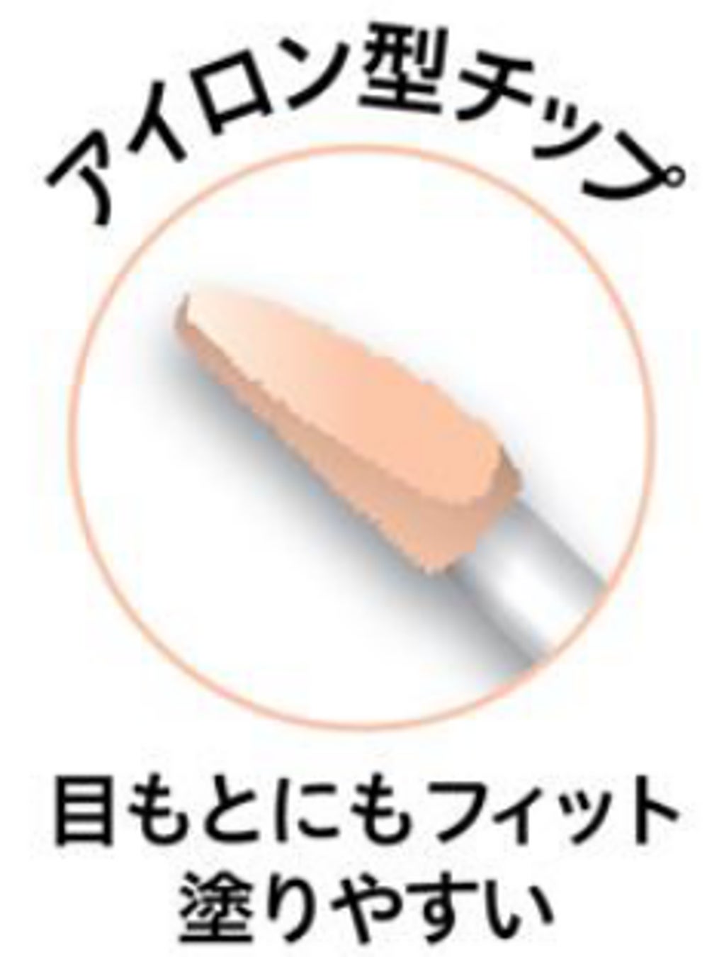 細部に届きやすいうすく細い先端と、肌をならしてムラなく伸ばせる平面カットがあるアイロン型チップを採用。小ジワの気になる大人の目もとにもフィットして塗りやすい。