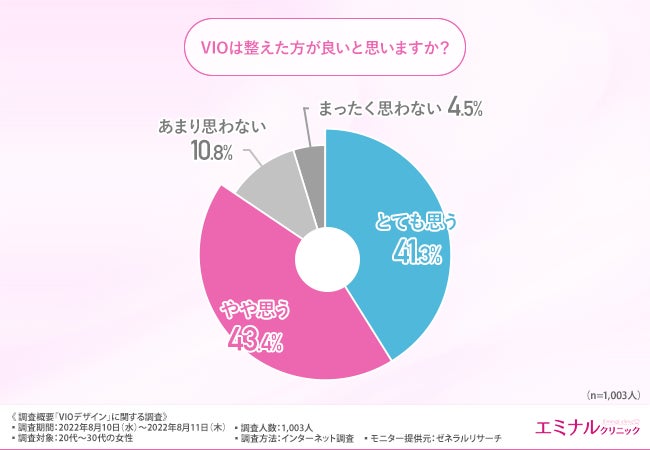 「VIOは整えた方が良いと思いますか?」と質問したところ、『とても思う(41.3%)』『やや思う(43.4%)』『あまり思わない(10.8%)』『まったく思わない(4.5%)』という回答結果になりました。