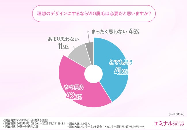 そこで、「理想のデザインにするならVIO脱毛は必要だと思いますか?」と質問したところ、『とても思う(41.2%)』と回答した方が最も多く、次いで『やや思う(42.3%)』『あまり思わない(11.9%)』『まったく思わない(4.6%)』と続きました。