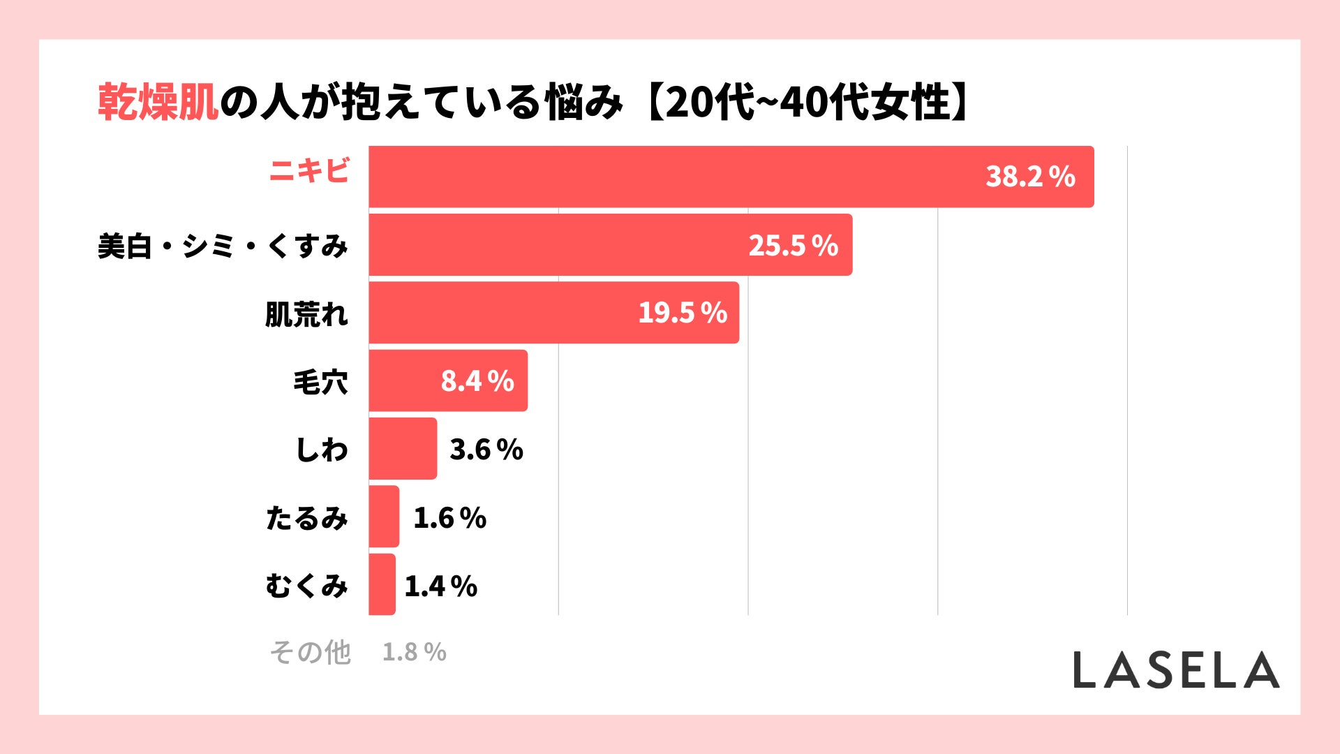 • 乾燥肌の悩みは「ニキビ」が38.2%で最多、「肌荒れ」の約2倍