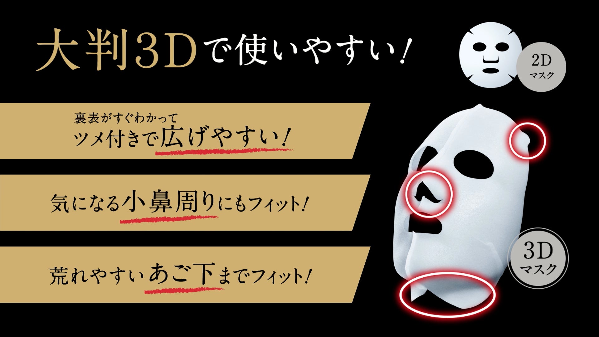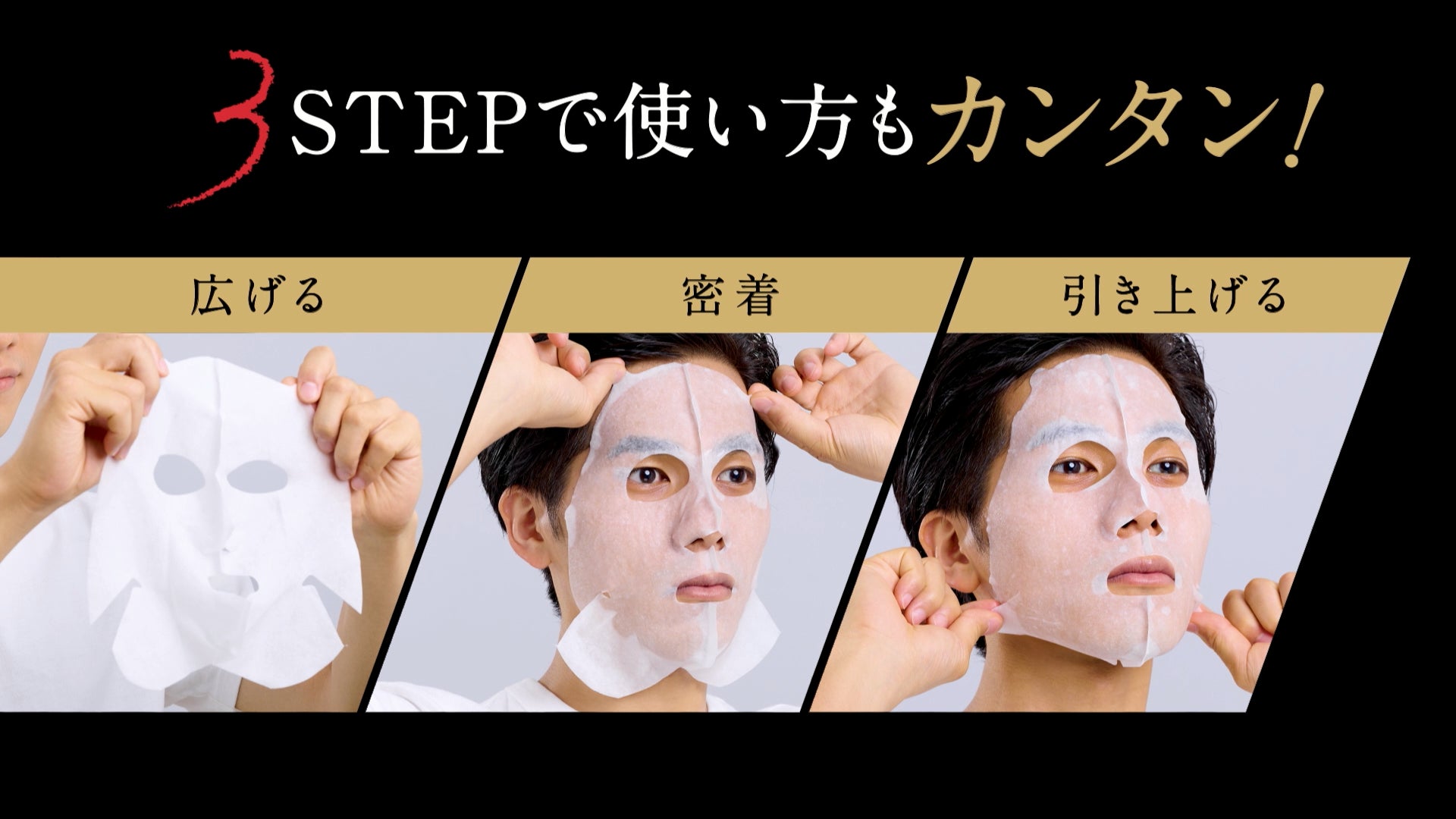 男性のあご下や小鼻までしっかり包み込む、“男性用大判3Dシートマスク”。ツメ付きでパッと広げやすく、簡単で使いやすい!