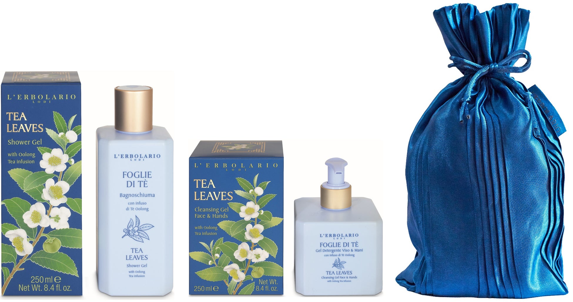 ①人気コレクション『フォリエ ディ テ』のシャワージェルとフェイス&ハンド用 リキッドクレンザー、ブルーのサテン巾着をセットにした数量限定のキットを販売いたします。