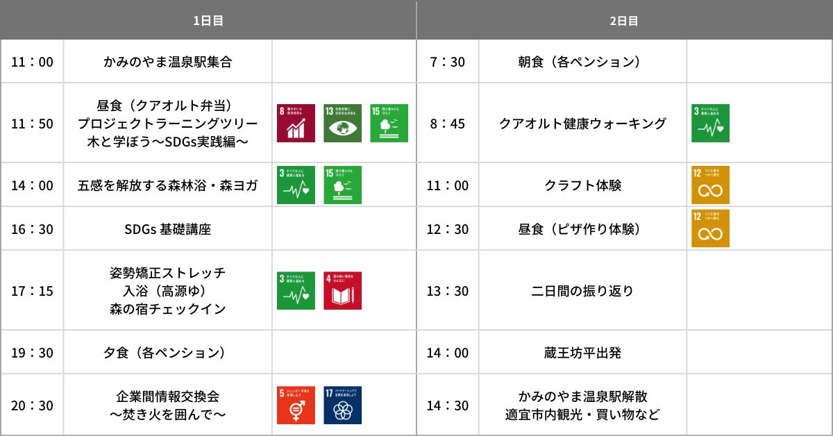 今回実施するモデルツアーも、数あるプログラムの中から、仲間と一緒に課題を解決してチームビルディングを図る「プロジェクトラーニングツリー」や、ドイツの運動療法を用いた“頑張らずに”身体を動かす「クアオルト健康ウォーキング」、森の中で五感を開き心と身体のバランスを整える「森林浴・森ヨガ」等、様々なジャンルのプログラムを体験していただき、企業における活用シーンを具体的にイメージしていただける内容でお届けいたします。