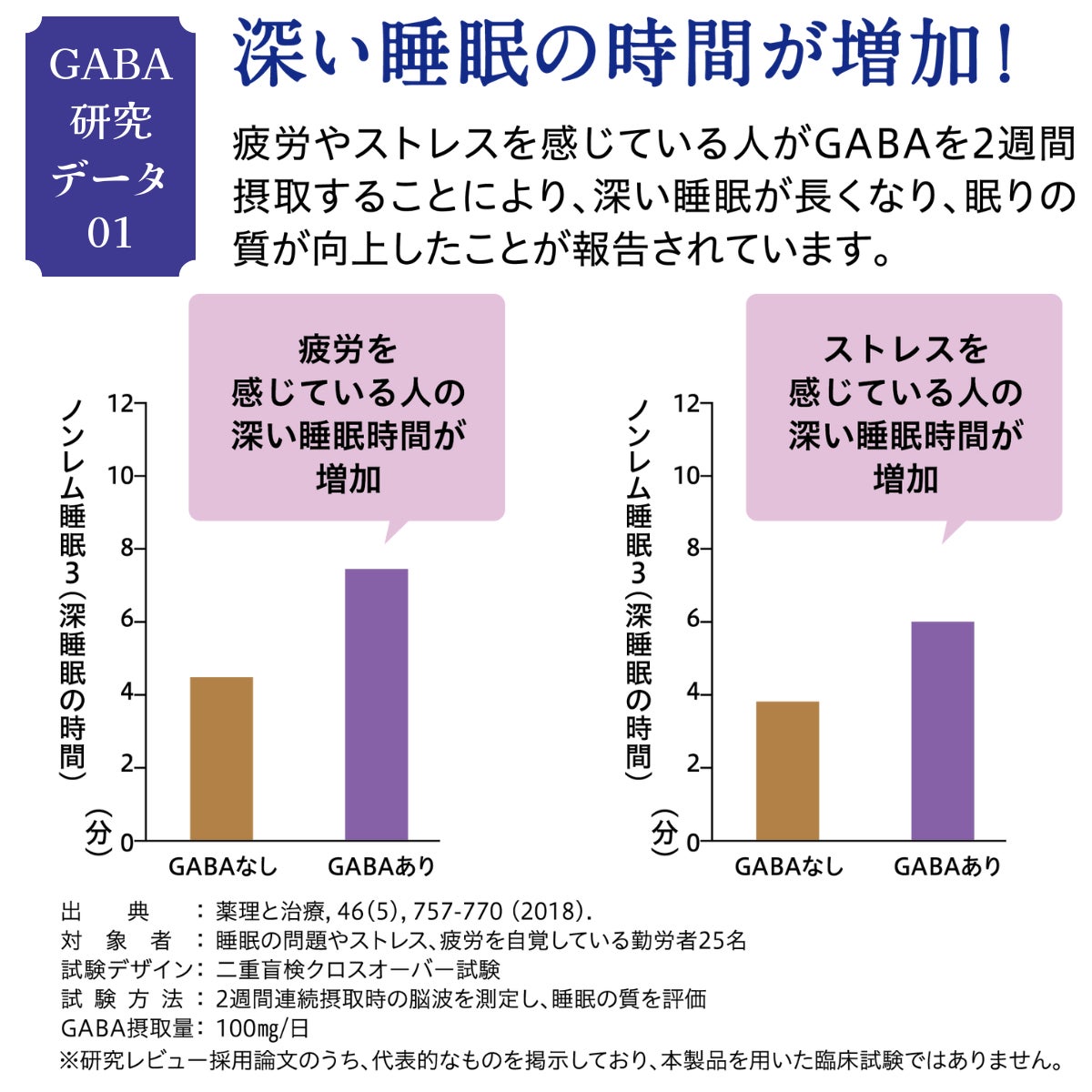 【届出表示】本品にはGABAが含まれます。GABAには、肌の乾燥が気になる方の肌の弾力を維持し、肌の健康を守るのを助ける機能、一時的な疲労感やストレスを感じている方の睡眠の質(眠りの深さ)の向上に役立つ機能、仕事や勉強などによる一時的な精神的ストレスや疲労感を緩和する機能、日常生活で生じる一時的な活気・活力感の低下を軽減することが報告されています。