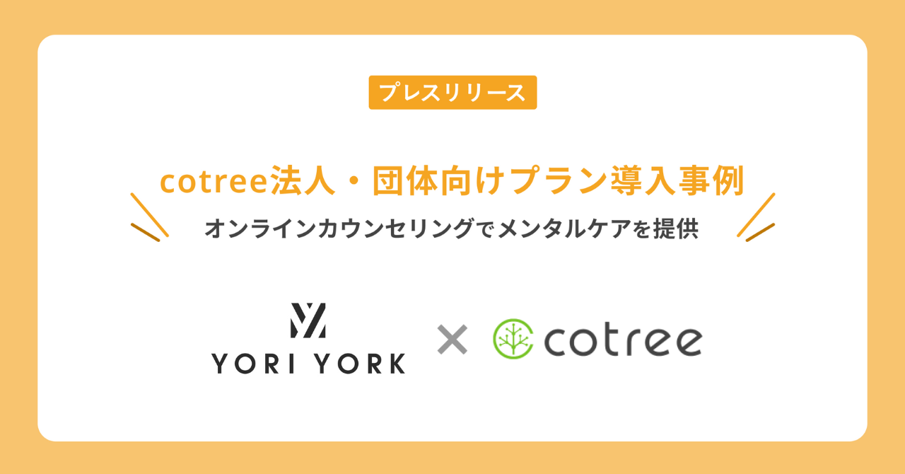 オンラインカウンセリング・コーチングの「cotree」を展開する株式会社cotree(本社:東京都中央区、代表取締役:西岡 恵子、以下cotree)は、株式会社Yoriyork(ヨリヨーク)(本社:栃木県佐野市、共同創業者:荒居 健太・石川 智章、以下Yoriyork)における「法人・団体向けプラン」導入事例インタビュー記事を公開いたしました。