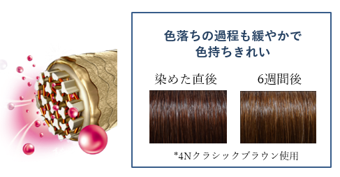 高浸透カラーで白髪をしっかり染めあげ、色落ちの過程もゆるやかできれいな色を長く楽しめます。また8種のアミノ酸がなめらかな指通りの髪へと導きます。