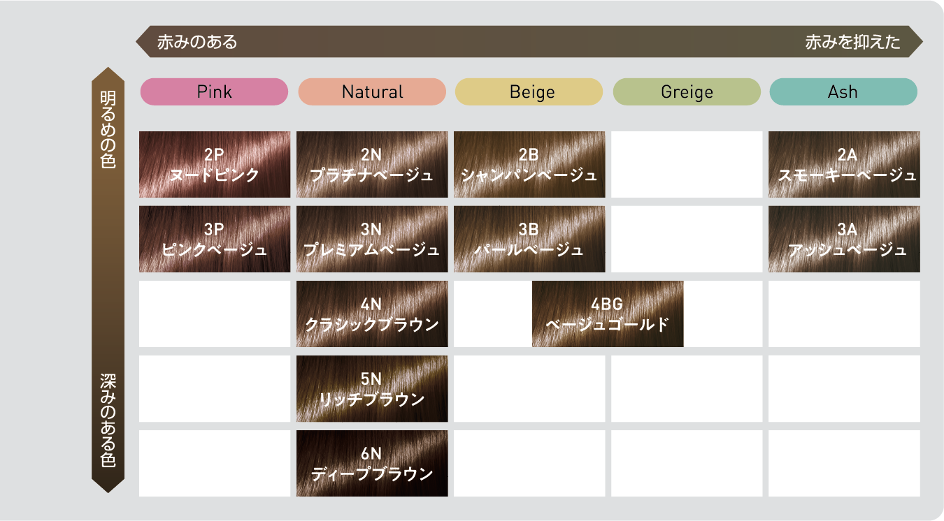 白髪をしっかり隠せる色を中心に、暖色系カラーから寒色系カラーまで全12色展開