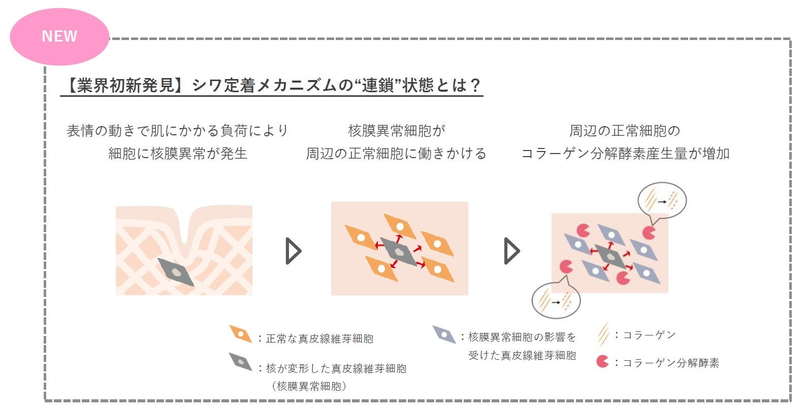 今回、新たに、くり返し表情が動く部位に発生する、“シワ定着のメカニズム”の解明に挑戦。その結果、表情の動きによって肌にかかる負担が原因で発生した細胞の核膜異常がコラーゲン分解酵素の増加を連鎖的に引き起こし、シワになりやすい状態を引き起こしている事を発見しました。