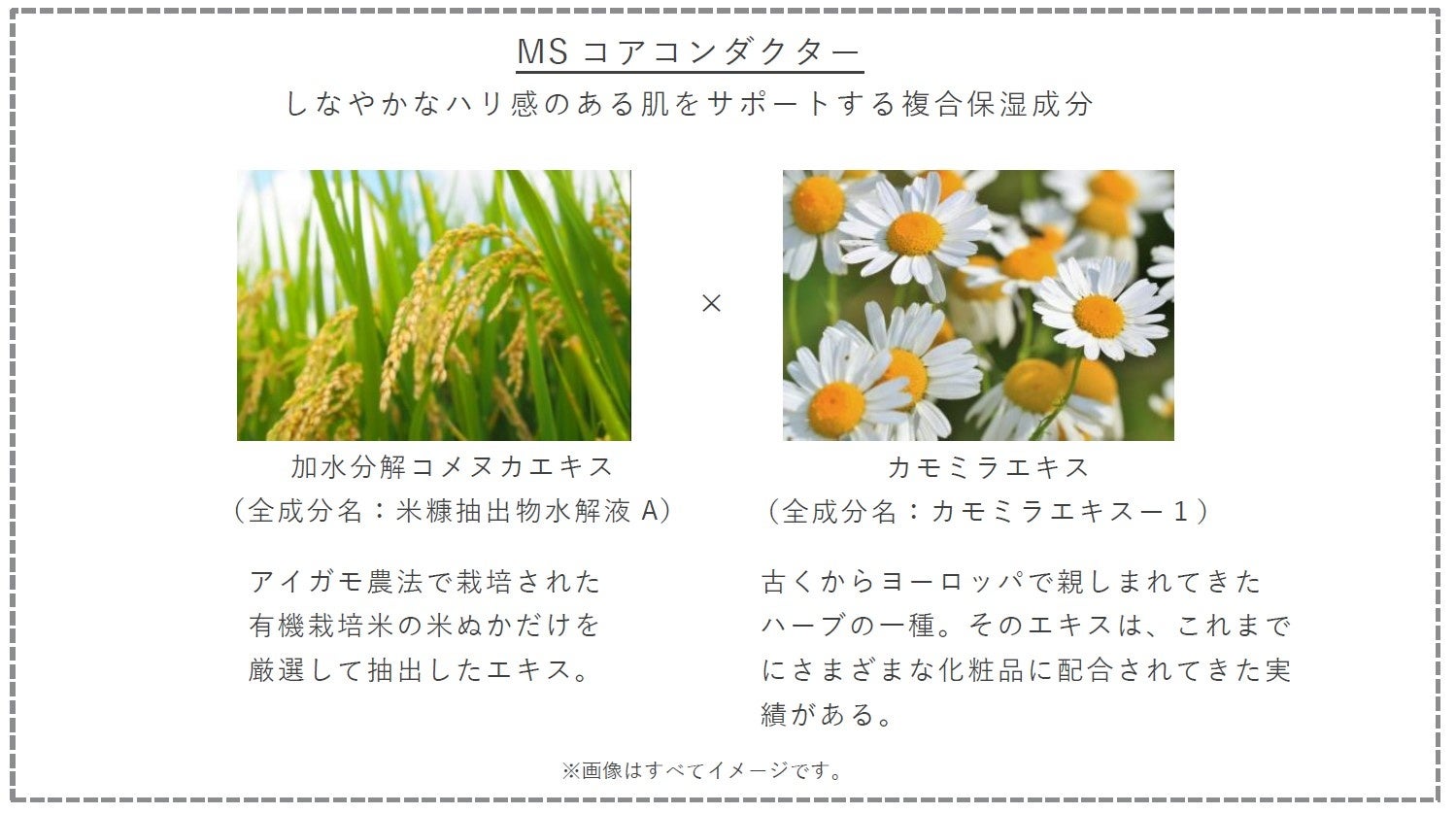 オルビス独自の成分アプローチとして、しなやかなハリ感のある肌をサポートする複合保湿成分、“MSコアコンダクター”を新配合。加水分解コメヌカエキス、カモミラエキスの2つのエキスの組み合わせがうるおいを与え、しなやかなハリ感のある肌をサポートします。