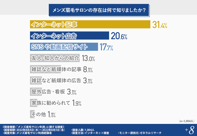 「メンズ眉毛サロンの存在は何で知りましたか?」と質問したところ、『インターネット記事(31.4%)』と回答した方が最も多く、次いで『インターネット広告(20.6%)』『SNSや動画配信サイト(17.7%)』と続きました。