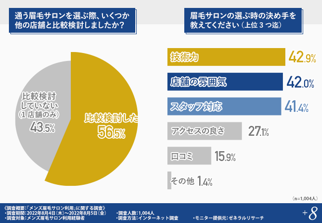 そこで、「通う眉毛サロンを選ぶ際、いくつか他の店舗と比較検討しましたか?」と質問したところ、『比較検討した(56.5%)』『比較検討していない(1店舗のみ)(43.5%)』との結果になりました。