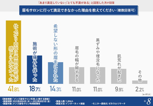 「眉毛サロンに行って満足できなかった理由を教えてください(複数回答可)」と質問したところ、『仕上がり内容に費用対効果が感じられなかった(41.8%)』と回答した方が最も多く、次いで『施術が痛みを伴った(18.7%)』『希望しない形の眉毛にされた(14.3%)』と続きました。