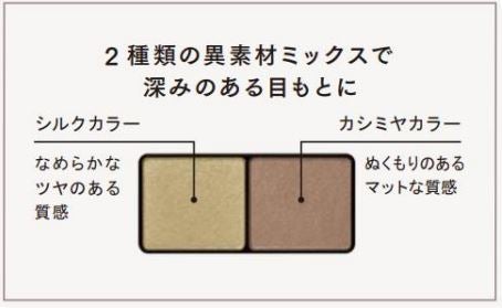 カラーパレットは、なめらかなツヤを放つ「シルクカラー」と、ぬくもりのあるマットな「カシミヤカラー」の 2種の質感のデュオアイシャドウです。 シルクカラーには旬のカラーを、カシミヤカラーにはなじみブラウンカラーを配置。 トレンドのカラーをブラウンベースのカシミヤカラーと合わせることで、取り入れやすく、華やかな旬顔に。2種のカラーで深みがだせる、抜け感を演出する絶妙なニュアンスカラーをお楽しみいただけます。