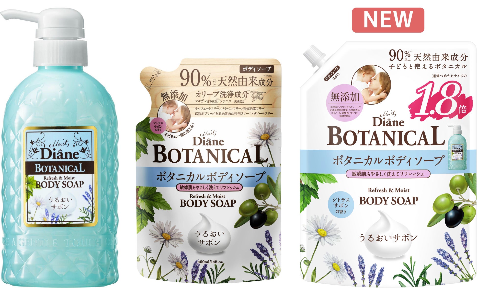 今回発売するのは、ポンプ式で使い勝手の良いダイアンボタニカルのボディミルク「バーベナ&ハニーの香り」「シトラス&ホワイトブーケの香り」「フルーティピュアサボンの香り」の3種の詰め替えタイプ。同じく詰め替えのボディソープ「リフレッシュ&モイスト」の大容量1.8倍タイプも、2022年9月15日(木)より発売いたします。