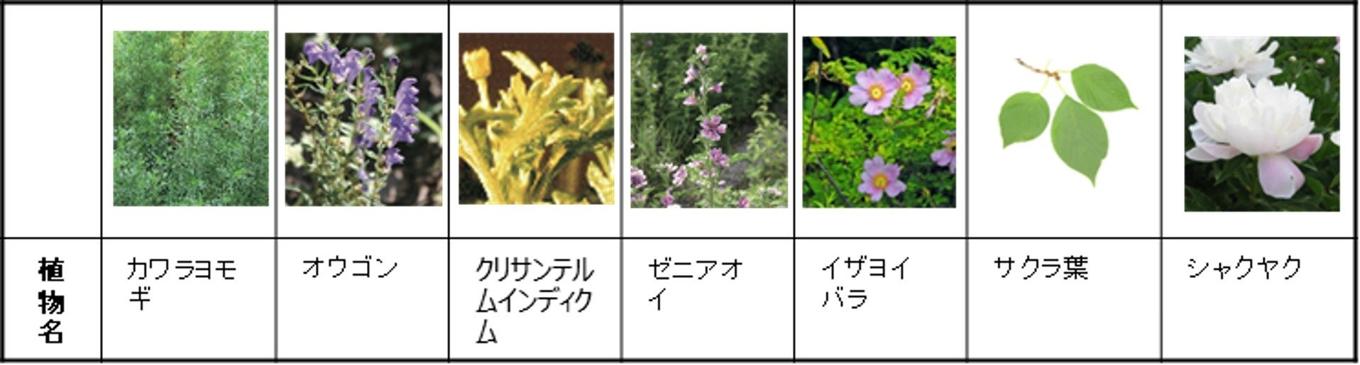 カワラヨモギエキス、オウゴンエキス、クリサンテルムインディクム抽出液、ゼニアオイエキス、イザヨイバラエキス、サクラ葉抽出液、シャクヤクエキス