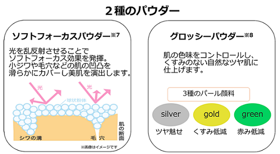 自然なツヤ感と程よいカバー力をあわせもつセミマットタイプ。2種のパウダーがなめらかなさらりとした美肌に仕上げます。また、高密着ベール(※6)が肌にぴったりフィットしてメイク崩れやヨレを防ぎメイクの仕上がりをキープします。
